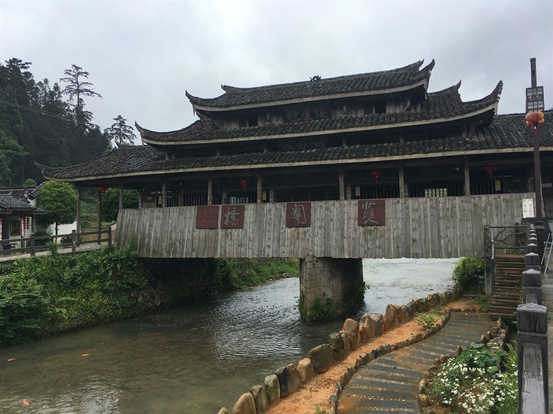 向前走去,迎面的这座廊桥叫“护关桥”。护关桥修建于清乾隆年间,距已有两百多年历史了,护关桥位于村庄水尾,根据古人选择村落的要求,“天门”只要有水入村即可,表示“不尽财源滚滚来”,但对村落出水处的“地户”讲究则相当严格,要看不到水流出村,“地户”必须关锁,财源才不会流失。为了“保护风水”,所以把廊桥造在村庄水尾。所以,护关桥也是一座风水桥。
