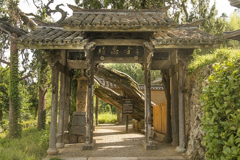 这座牌楼式建筑是“时思寺”的山门。这种山门称为照壁式旁开山门,这是一种古老的、现代罕见的山门。它不是那种以招揽香客为宗旨的开放山门,而是以禅林清修为宗旨的半封闭式山门,具有深山修行的特色。