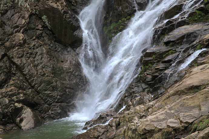 山顶的泉水奔腾而下,在岩石的碰撞之下碎落溅射开来,就像飘落的雪花一样美丽,不禁让我沉浸其中。
