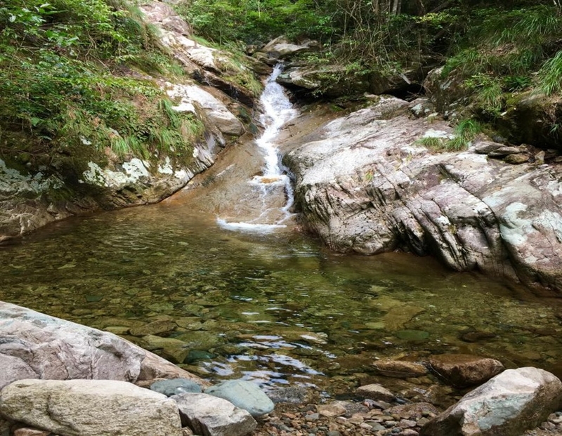 钱江源不愧为国家森林公园,山明水秀,绿树成荫,水流从高处流下,形成一个小水潭,清澈见底,一眼望下能看见水底的小石块。这时想起城市里的那条条河水,浑浊不堪,连河底是个什么样子都看不清。还有不同的就是那自然的清新空气了,刚到钱江源深吸一口清新的口气,再吐出来,像是吐出了工作时的疲劳一样。