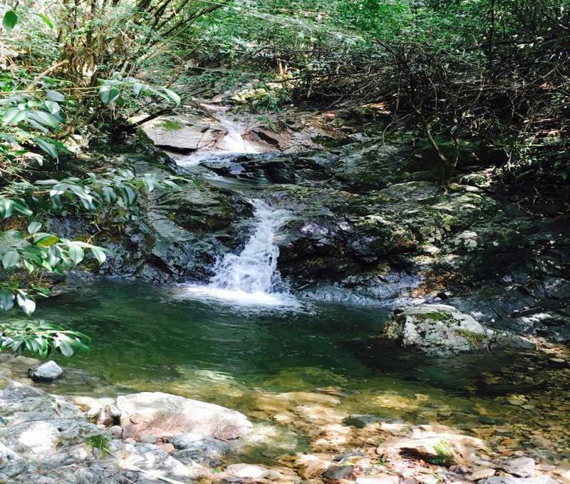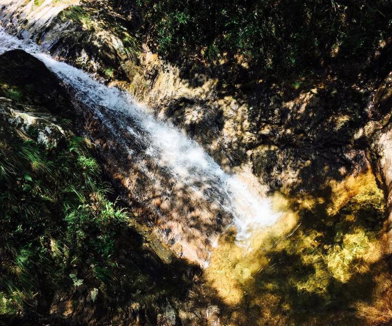 于林间穿梭,时不时的能看到水流从高处流下而形成的小水潭,能听见水流击打突岩和落下拍打水面响声。