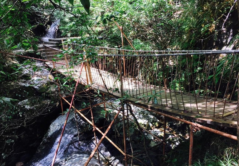 看到这座桥的时候,想到要从这座桥上走过,内心是有点拒绝的。好几根钢管,木板,绳子搭起的一座小桥,看起来貌似不安全的样子。但不过为了继续下去,还是硬着头皮上了。等走在桥上的时候,才发现虽然看起来很简便的样子,但还是比较的坚固,走起来还没有什么晃动,听着桥底水流的声音,也是安了心一般,走过了小桥。