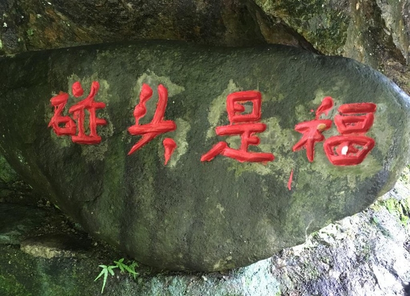 走着走着,一处悬崖挡住前路,一块岩石凸出在路上方,左下方善意地写了红色的“碰头是福”。很有意思,让人看了忍俊不禁。