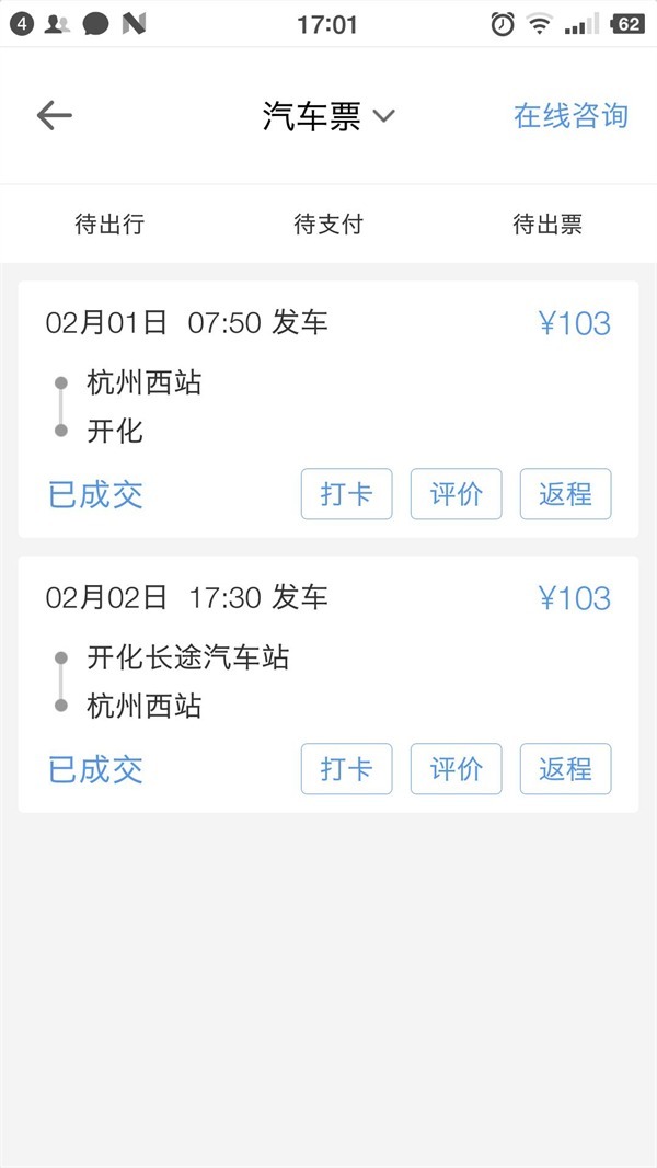 手机上买车票,我买的是杭州汽车西站到开化长途汽车站的汽车票。100元一张,服务费另外加2块钱,还有1块钱的抽奖费用,抽奖那里记得别打钩,我就是没看到,白白浪费了2块钱。正常情况下车程3.5小时(上高速)。