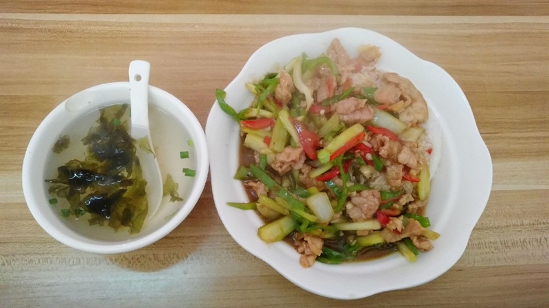我来到了对面的一家小餐馆,点了一份青椒肉丝盖浇饭,13元,很经济实惠。
