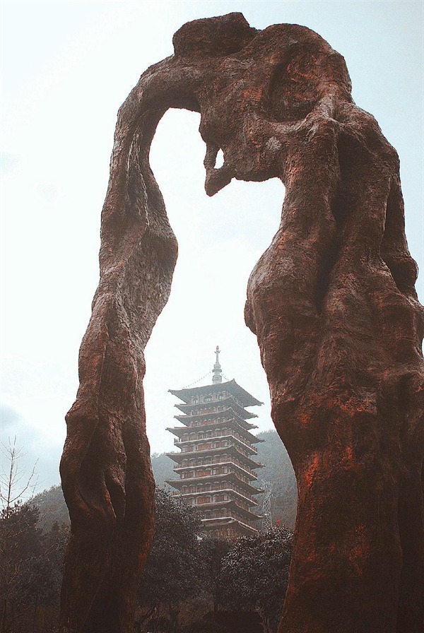 进门就看到一座巨大的根雕印入眼帘,这是一座由门雕塑、奇石、八卦图一级根文化的雕塑、茶文化雕塑组成的一个雕塑群。门的雕塑是用玻璃钢仿铜制作,高十一米,徐大师打破了根艺作品室内陈列的常规,开拓了根艺创作的新空间,“门”包罗万象,是界定的标志,也是求知悟道法门,是带来的福气、财气、运气的吉祥之门,也是迈向成功之门。