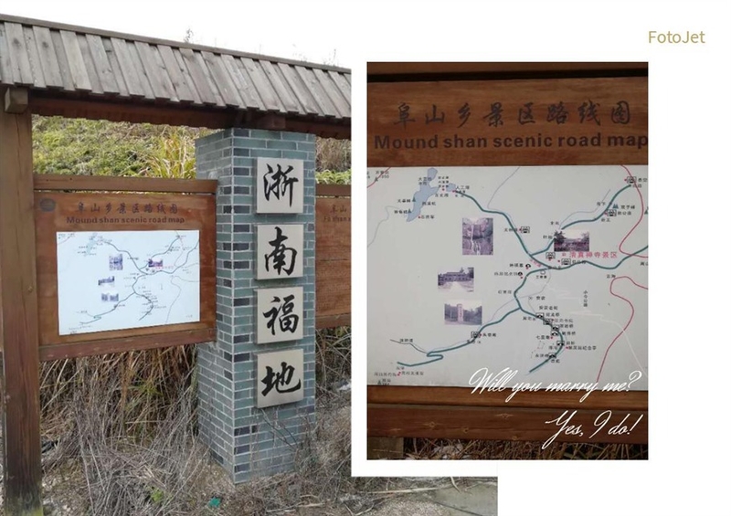 到达山巅,群山已在我们脚下,前方映入眼帘的是“阜山人民欢迎您”的牌坊,边上设“眺云亭”,顾名思义是看云海的有利位置。牌坊与凉亭中间,树旅游导航牌,“浙江福地”四字彰显夺目。其上介绍,乡内除清真禅寺外,有北斗七星墩、明清古建筑、千年古道、层层梯田、百丈瀑布等,因此次行程安排较紧,顿觉惋惜。