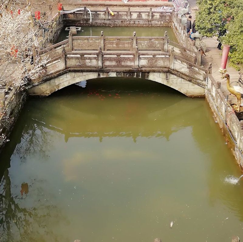 寺内放生池内,养有锦鲤与长寿龟,池底铺满了一层许愿币,闪闪发亮。池的周围有一排排栩栩如生的雕塑,都是寓意着吉祥的动物。园内栽满了植物,恰逢梅花季节,确未能凌寒独自开,两颗桂花树与之争艳,别有一番神奇。
