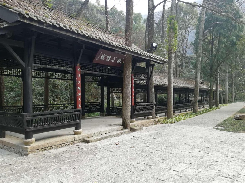 进入景区,路面全由石板铺砌,非常平整,两旁绿树成荫,想来定是避暑胜地,现大 寒时节,倒增添了几分寒意。向前步行约300米处,有一凉亭,木结构,古色古香,可供游人纳凉歇息。工作人员说夏天这边游客会多许多,大家自带点小零食,坐在亭子里聊聊天,或者一家人来个野餐。