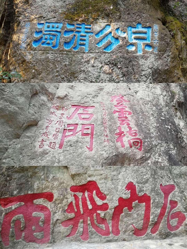 凉亭对岸岩壁上有多处摩崖题刻,据介绍,整个景区汇集历代文人墨客之佳作,共有摩崖碑刻105处,其中摩崖题刻共有80处,碑刻共有25通。仅摘几处,供大家品鉴。对文学有研究的游客可以好好研究一番。