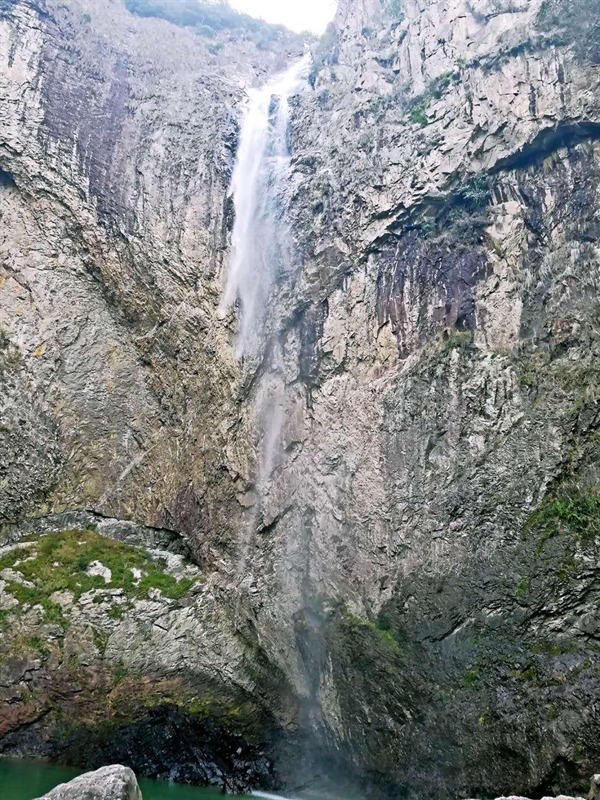 沿溪流行约3分钟,可闻瀑布声,并没有小学课本所描绘震耳欲聋,想来是因为冬季枯水期,雨量较少,瀑布较小。峰回路转,只见瀑布从百丈崖上飞流之下,山风吹过,带起一层雨雾,倒也还壮观。听同行伙伴描述,夏季时分,在山崖下,耳不能闻,衣裳尽湿,方为奇。