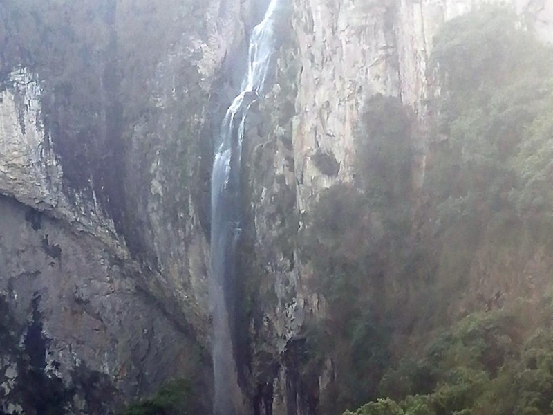 该处为分叉路口,向左为石门飞瀑,向右为石门山庄、石门书院,景区内标识牌众多,方便游客通行。来到石门洞,肯定要先一睹5级飞瀑,感受一下郭老所描绘的壮观,看能否让姑娘我也吟诗作对一回。沿着农家乐往里走便能看到这瀑布。