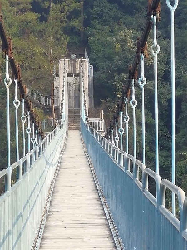 原路折回,回到景区入口,沿崖向上步行约15分钟,可至天索桥,该桥架于旗山和鼓山之间。立于桥中央,左岸为瓯江风情,右侧为飞雨瀑布,前后为旗鼓险峻,秀丽河山,尽收眼底。