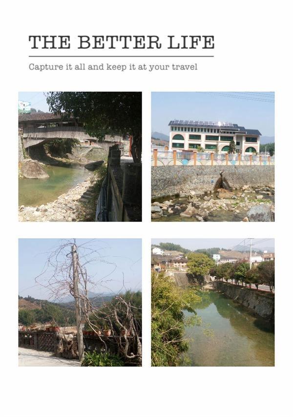 从梁柱式的木拱桥之间穿过,感受它的年代感,伸手触摸柱子光滑的表面,桥边是淙淙流动的溪水,从高坡流下在底下汇聚形成一个个白色的浪花。溪里翠绿的水草。还有长在溪里的绿竹,绿的分外惹眼。