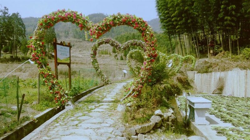 离开花田,走过来时的桥在往里走几步便是到了马坑村。走过心门又在摘心亭的摇椅上小憩了一会。感觉又是满满的能量。走过一片用竹筒摆置成心形的围栏,穿过这里的民居便是通往心田的心路,我看到一个个用假花缠绕出来的心形圈,像极了我梦中的婚礼。从心圈中走过感觉空气都是粉红色的。顺着这条小路上行便到了同心林,同心林是一片竹林,林里竹子高耸粗壮,竹林中间有个巨大的心锁是用木桩堆叠而成。结同心,结百世情缘,锁同心,锁百年好合,这便是同心林与心锁相辅相成的深刻含义。
