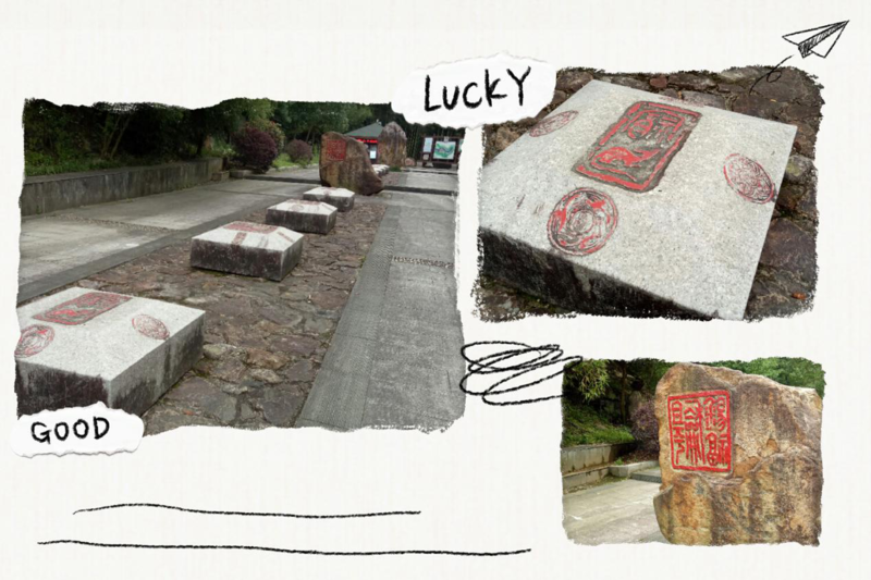 这里还为这些石印专门设置了印园,可见当地人对印的执着和喜爱。让我印象最深的是一对叫做“心心相印”的石印章吧!一对石印的上部用一个爱心相连,或者说更像是一对情侣相拥的样子,也许这是所有天下有情人都想追寻的“愿得一人心”吧!而不是“背灯和月就花阴,已是十年踪迹十年心”无奈了。