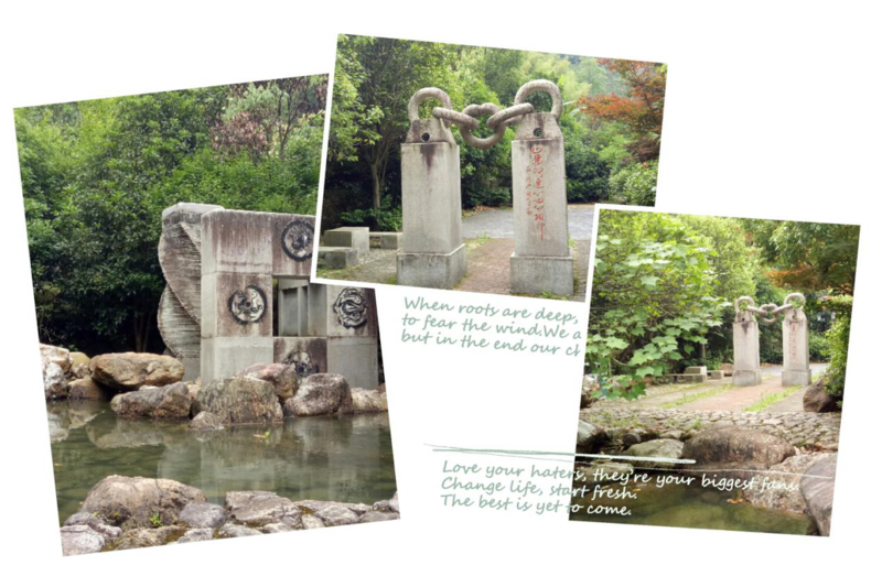 与千丝岩近距离接触才知道,这其实更确切的说应该是个石印文化公园。景区内大大小小形色各异的印多到数不胜数。而且字体也不同,但大部分还是印章惯用的小篆,还有少部分是花鸟纹的闲章。学过些许书法,知道印在书法作品中绝对是不可缺少的东西,书印相映成趣,不但使书法作品增色、活跃气氛、起到锦上添花的作用。因此,拥有农家乐省美的乾隆皇帝总是在自己喜爱的书画作品上盖自己的印章,这也是不无道理的。