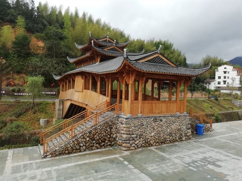 在经过一排整齐排列的木拱廊桥前,我停住了脚步,绕步于木柱之间,时光仿佛回到了很久以前,青涩的少年时代,三两个小伙伴玩着你追我赶的游戏。廊屋剖面由4柱9禀穿斗式构架,这样的构架为一个奉字。奉也称为将军柱,其檐柱选用粗大,笔直的木料直接向下连接着木拱结构形成整体梁柱结构。