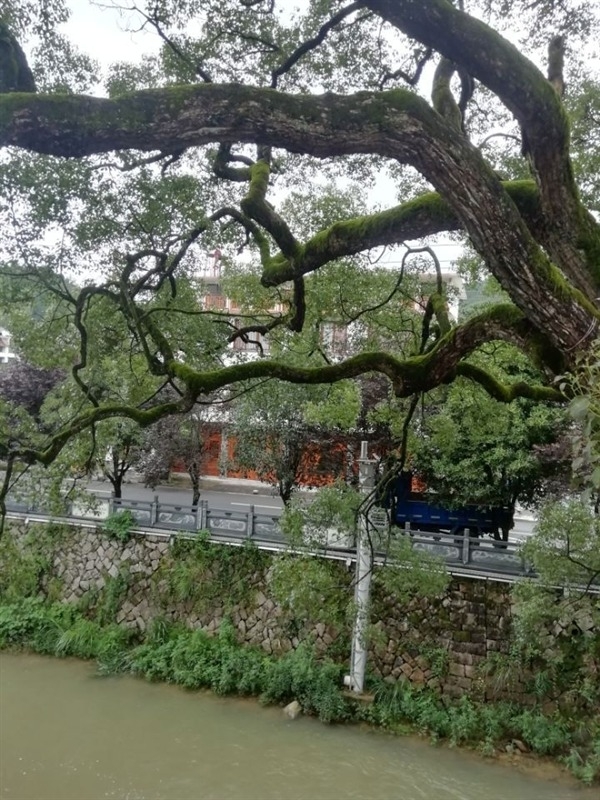 从小径下来,慢慢的向前走。天色又暗下来。天色阴沉沉的好像别人哭丧着的脸,河里的溪水很浑浊,早已经看不清他本来的面目。只是翻滚的白浪声势浩大。从溪边的石头缝中硬生生蹦出一颗巨大的老樟树来,樟树很大,枝叶伸长开来,就像无数条章鱼的触脚、向外延伸着长出片片新叶、就是到了秋天也是一如既往的茂盛。后来我才知道,这颗古老的大树有个很好听的名字叫做凤凰樟。由一个凤凰衔枝的故事而得名。