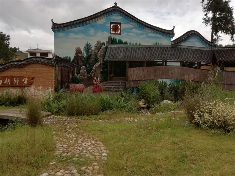 沿着河道一直走,走到尽头便是廊桥遗梦。墙上面用彩色的画笔画上了一对身着嫁衣的畲族新人,他们牵着一头牛。站在那里,脸上洋溢着幸福的笑容。在他们之前,有座小小的石桥,底下是小小的荷塘,荷塘里长着一些芦苇,围着小小的荷塘绕着一圈,有几只小鸡仔叫唤着向草丛里跑。人一靠近,就害羞的躲起来,很是灵秀可爱。