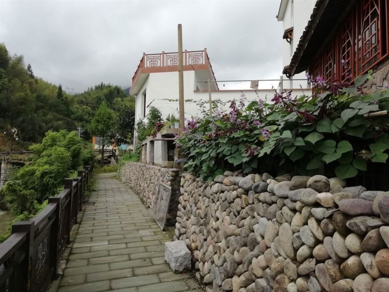 过了桥便是集仕广场,传说是青年男女谈情说爱的地方。广场后面便是用彩色石头堆砌的老屋。我从一条石头铺成的小径漫步上行。走在青石板的台阶上,呼吸着新鲜的空气。道路边的野草仿佛也感受到了秋的来临纷纷披上黄色的新衣,高处的粉色牵牛花开的正盛。在野草中显得特别鲜艳。