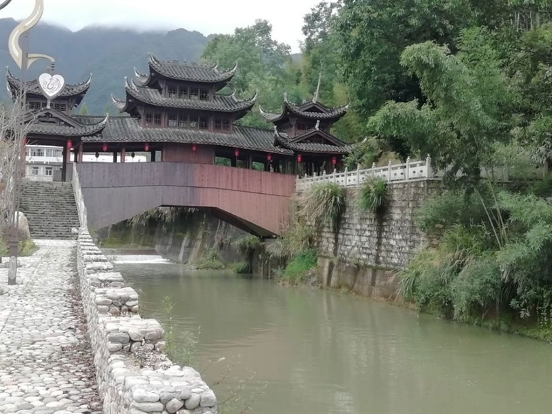 抬眼向前看,河边的玻璃栈道不远处,有座三檐的廊桥,两边各有个小小的亭子连接着,桥身颜色分为两段,一边暗色,一边仿佛暴晒下掉了颜色,淡了很多。