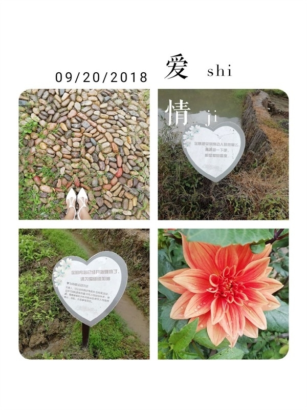 今天的天气有点暗,好似不一会便会有一场倾盆大雨的模样。在我行上一段路后天仿佛又放了晴,多变的天气像多变的情绪。车子停在等车的点,我又慢慢的散步到了小镇的入口。依然是那分为两半的高矮不一的心墙。墙上左侧的地图以一种枫叶的模样分布出去,用细细的黑线连出去,每一处线连接的地方都有一颗火红的爱心。仿佛每到一处,都有爱情的味道。他们又自分散,又彼此相依。心墙前面用木桩围成的心形草坪上,细碎的小花开的正盛,朵朵零星点缀着。