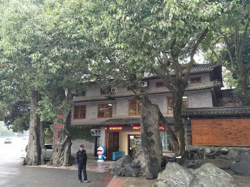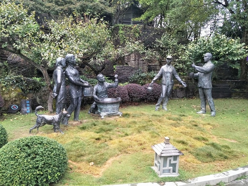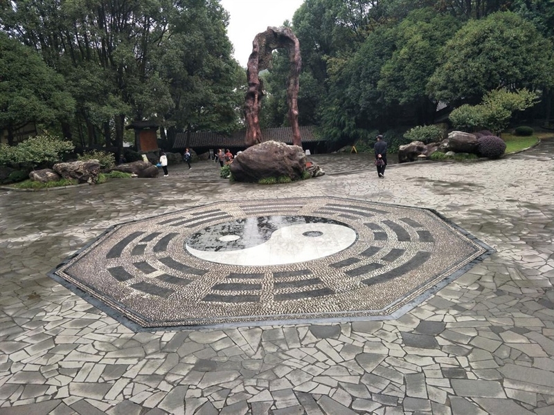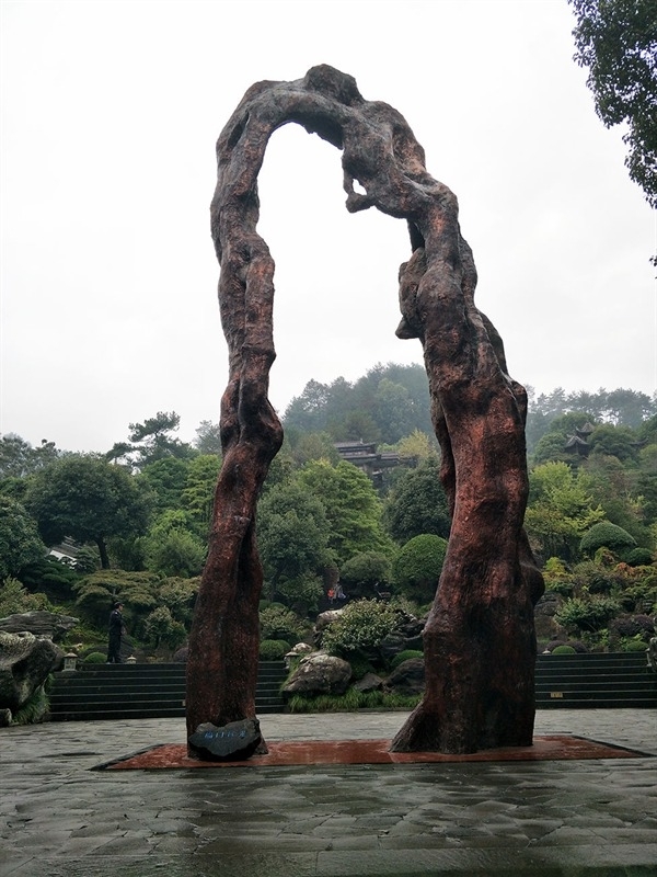可能是因为现在是旅游淡季,所以人不是很多。检票的时候完全没有要排队。我出去玩其实最怕很多人。感觉人一多,不知道是来看人还是来看物了。检完票进去之后,首先映入眼帘的就是一扇根雕的大门。听说作品的原型就是徐谷青大师的《世纪门》。以这扇包罗万象的门作为界定。既寓意求知悟道之法门,又寓意吉祥幸福,再加之两旁的奇石,茶文化雕塑以及地上的八卦图。共同组成了第一个景点—福门祥光。