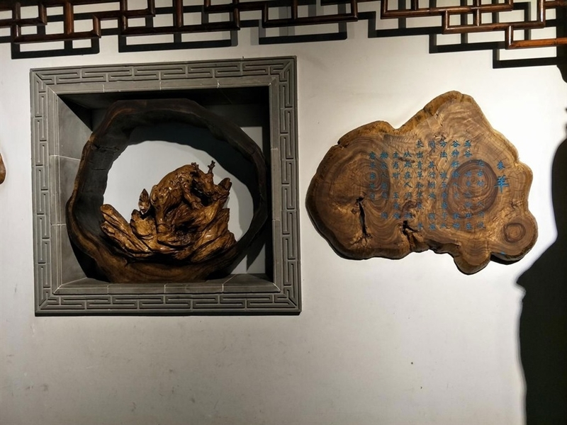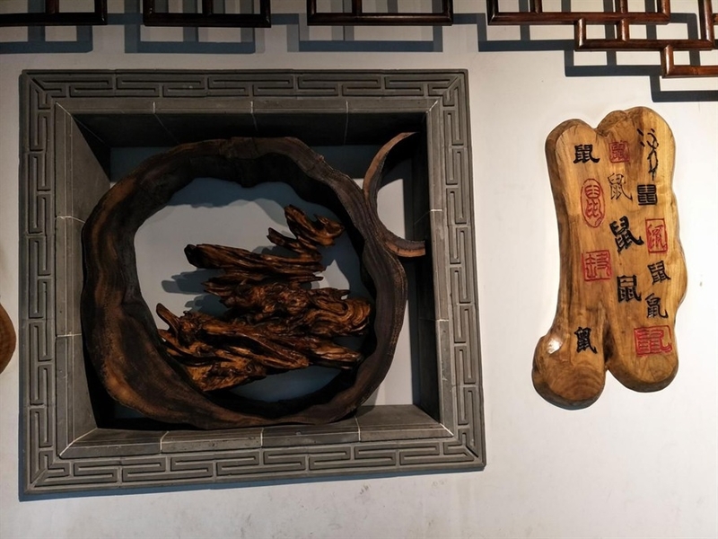 进门转右,是十二生肖文化长廊,我在这里流连了许久,听说这些作品是用香樟树根制作。我很喜欢香樟这种古老而神秘的味道,每每闻到总会觉得内心很安宁。长廊上摆放着香樟香樟根切片。上面刻录了关于十二生肖动人的故事。还有十二生肖的来历以及中国汉字八体书法的演变,我实在是太喜欢这种带有历史沉淀感的作品。被时光慢慢打磨,散发着属于自己的光芒。