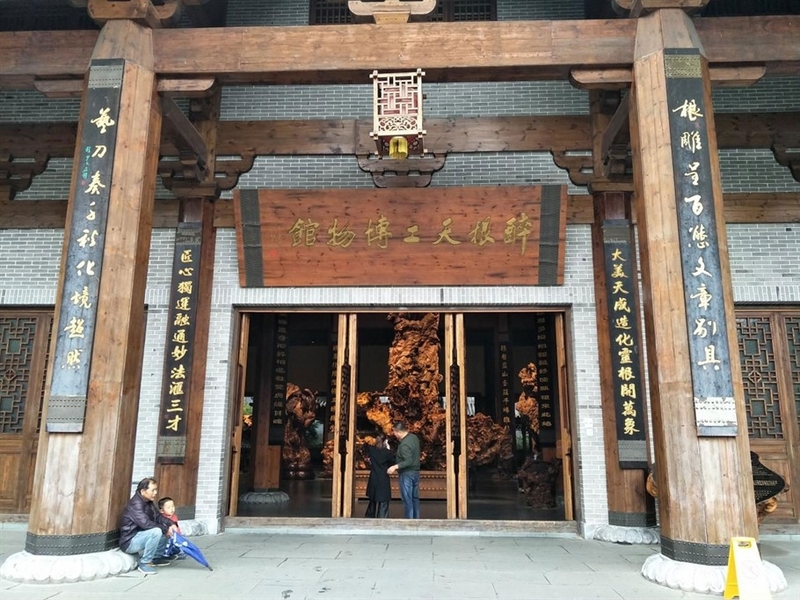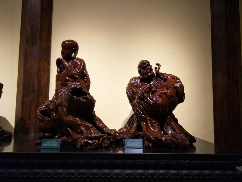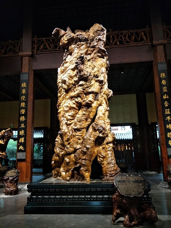 整个博物馆分为上下两层,馆内均是大师的作品,第一层陈列着大型根雕作品二十余件,第二层陈列的是各种稀世珍品和重要的文献资料,一进门就能看到大厅中央那座硕大无比的根雕,我真的被震撼到了,解说员告诉我这件作品的名字叫做《根魂》。长八米,重八吨,我看着这件硕大的作品,不禁在想,这么一件作品,得耗费多少心力,多少时间才能完成。此刻我真的能在这件作品上感受到艺术家们在创作时是多么的辛苦。