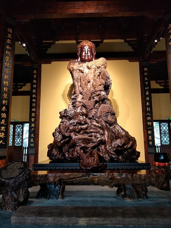 我看着眼前的佛像,那栩栩如生的神态,果真是要有较高的艺术水准才能做出如此生动的作品。一楼的弥勒佛是最受人欢喜的,让人想起那句,大肚能容,容天下难容之事;慈颜常笑,笑世上可笑之人。大雄宝殿的根雕释迦牟尼佛,重达40余吨,是目前世界上最大的根雕佛像。