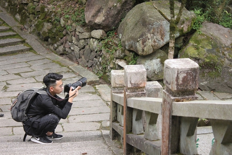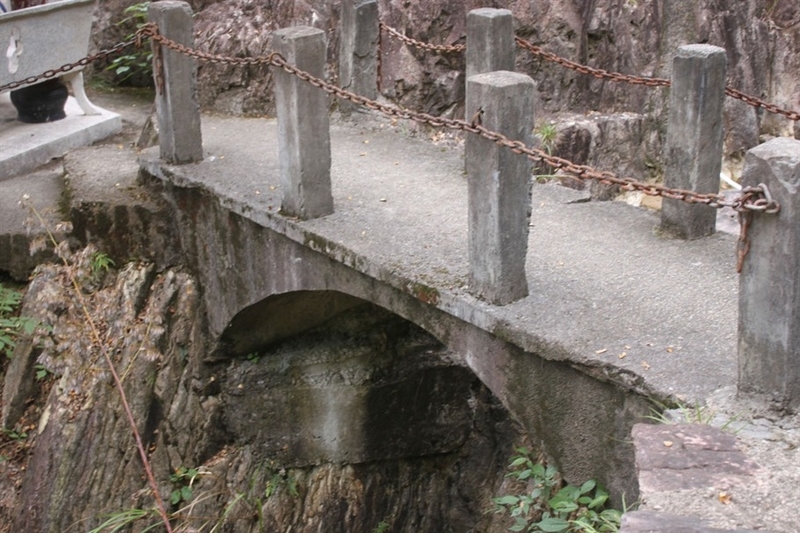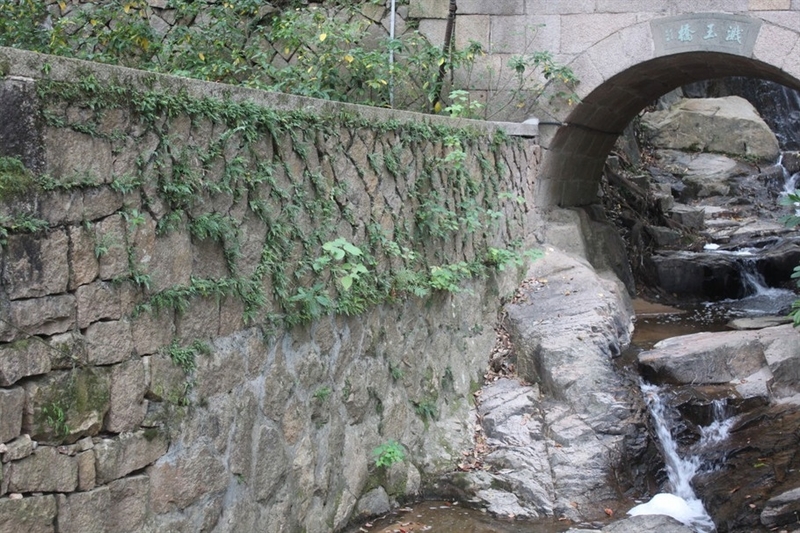 沿着石阶往上走,每走一步,心中总能安宁几分。这里似乎有一种神奇的力量总能让我没来由的感觉到安心。沿着道路一直走,石质的栏杆也变成了仿制的木栏杆。往下便要倘过一条小河。河里的地势不高,水流一点一点从上面高一点的地势落下来,汇聚在一起激起白色的泡沫。河道两岸皆是枯枝烂叶。入秋了,又是一年,时间走的真快。仿佛才是初春,转眼便是冬至。