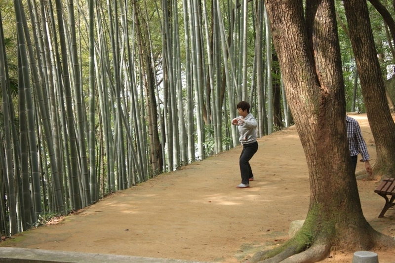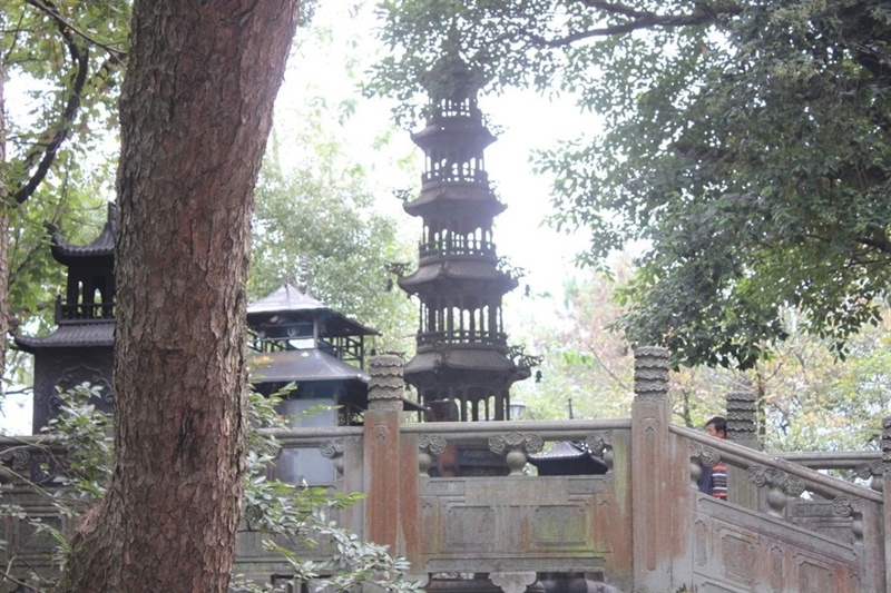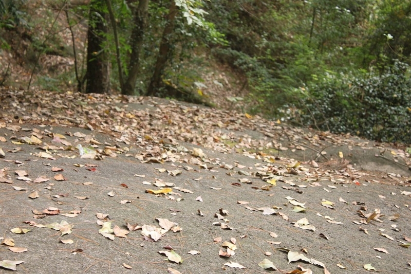 寺庙之后,有一条石径小路通往着后山,后山上便是一片竹林。林中有位女子在此练习太极,太极是以柔克刚,以静制动的一种运动。看她练的很是入目,不便打扰。顺着小路前行在一座六角亭里休息了一会继续前行。越是往前,越发的让你感觉到秋意浓。那满地的枯叶仿佛要将整个道路占领。翠绿中夹杂点黄色,却也是一种说不出的美感,就像大自然的画作,在绿色中添加了几笔黄,却也鲜艳惹眼。