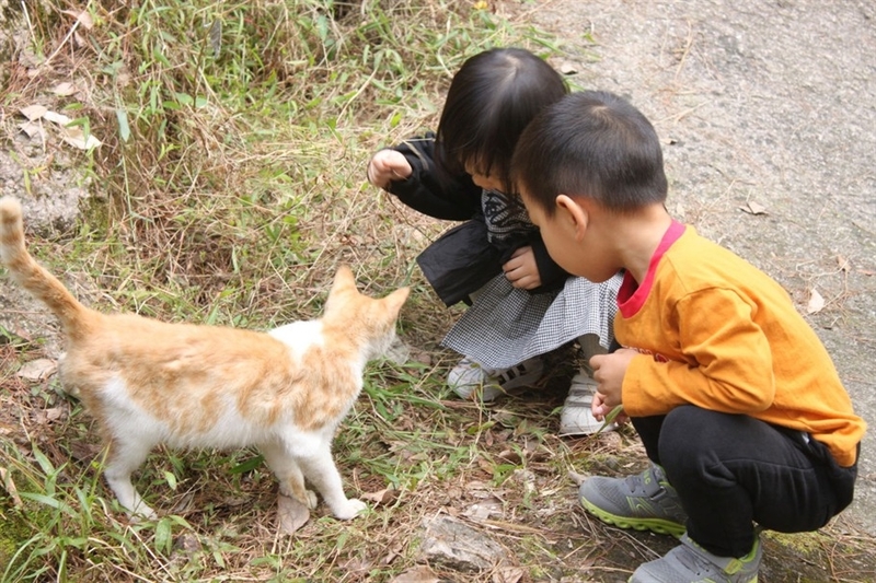 几个孩童蹲在地上与小猫咪玩起了游戏。童年的模样真好。我捡了几片树叶放到鼻子边,那淡淡的叶香顺着我的鼻息慢慢的蔓延到我的四肢百骸。我喜欢这种木香,那是自然的味道。