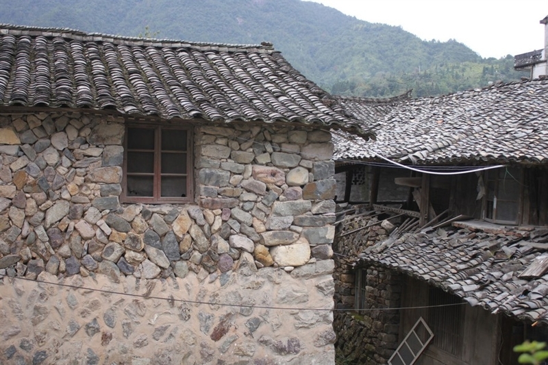 走过一座石语桥,往上走便是碑林。碑林之上,有座石锁桥。两边皆是石柱,只用石锁连接着。大有一种探险的感觉,这种场景在很多电影的场景里你总能看到。铁索上满是铁锈。从石桥上走过,从高的地方望向远处,群山包围了山下的整个村子。
