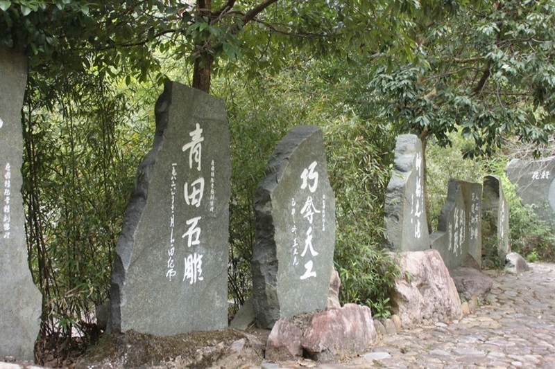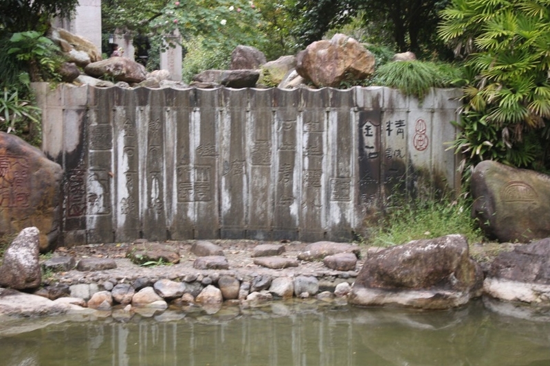 从一条曲曲折折的小径走过,小径旁边便是一个小池塘,池塘旁边的石头上刻着印园两个绿色的字体。塘里的锦鲤在在池塘里悠闲自得的遨游着丝毫不被打扰。有处石壁上皆是题字,就像古代的书简被放大了一般,因岁月的冲刷字迹变得斑驳似乎,灰白相间的模样。
