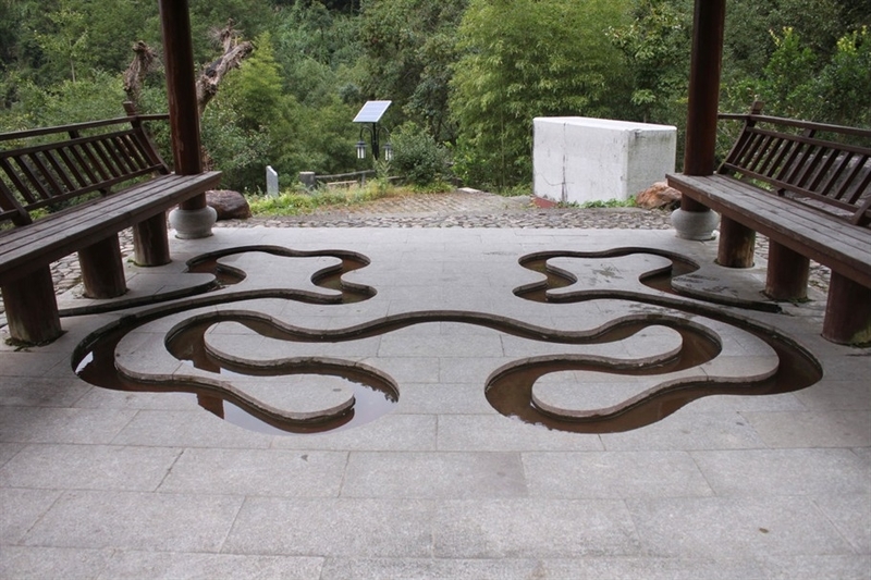 行到一处亭子,我停下了脚步。游览过很多地方,亭子也见过不少,但这个亭子却让我忍不住驻足观赏。亭子的地面是镂空出来的一条蛇形曲线。又如哪吒的混天绫一般,在里面注上水,便算是形成了一个蜿蜒的水渠。