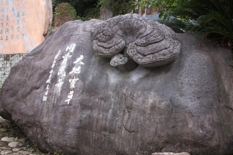 我印象深刻的是有一块灰黑色的大石头,石头中间有一颗石刻的灵芝,仿佛从石头中间钻出来的一样。旁边还有题字,天地蜜草,大抵说的便是这个灵芝。