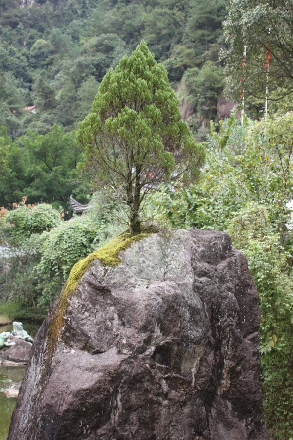 还见到一处奇特的场景。一块红褐色的大石块上,赫然长着一颗小树。小树周围爬满了青苔。石头里没有泥土,小树又是怎么从里面生出根枝,并还能茁壮的成长令人费解,也是一种匪夷所思的现象,你不得不感叹植物的生命力很旺盛。它总是以一种你所不能解释的方式存活下来。