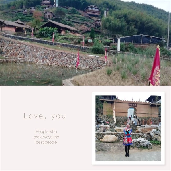 门楼前站着一个畲族姑娘,身着畲衣,亭亭立在哪里。应我的要求,畲族姑娘用双手比了个畲语手势。寓意着吉祥如意幸福安康。