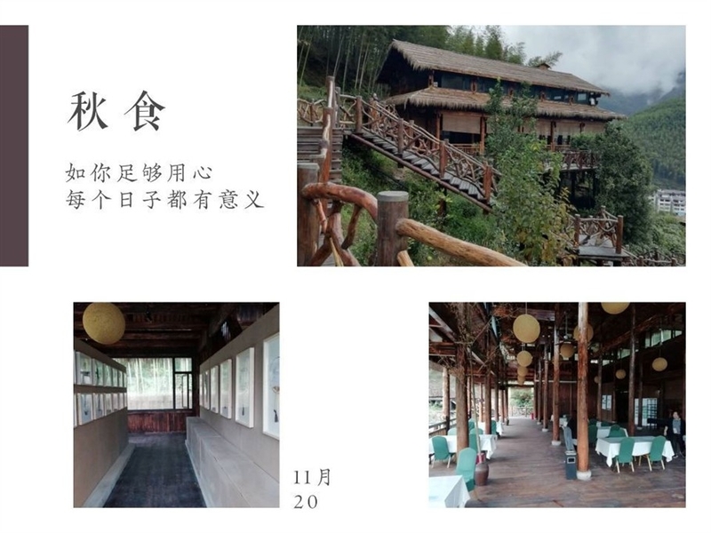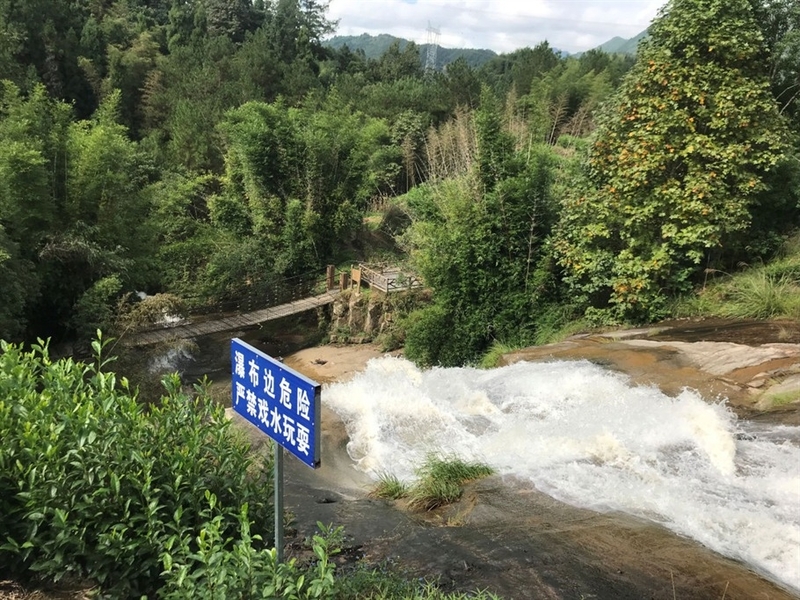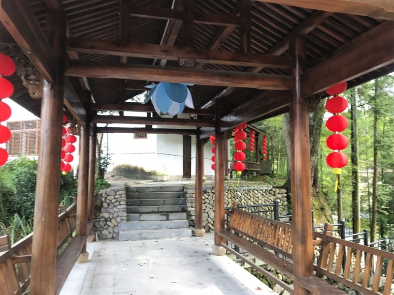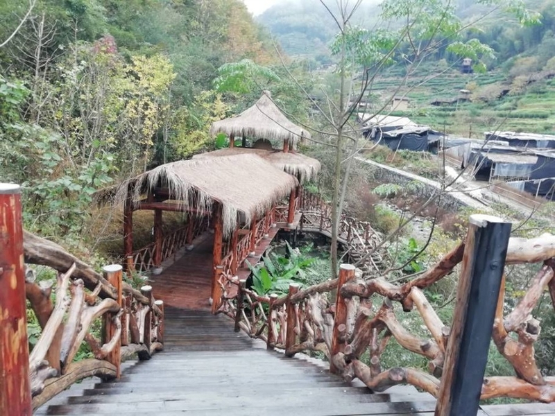 有座石桥连接对岸,有条小径通向前方。我没过石桥,一直沿着小径往前走,沿途而上,你一路能听到潺潺的流水声,地势高的地方,激起的白浪更为大朵,声势浩大。沿途你总能看到草棚顶,竹木架的鸡笼子,还有穿着蓑衣的木亭可供游人休息。我最喜欢亭子里极为特色的灯。那灯你仔细观察就像用原麻色的绳子一圈圈绕制而成。也像妈妈织毛衣用的毛线球,只是线很纤细,做工很细致。