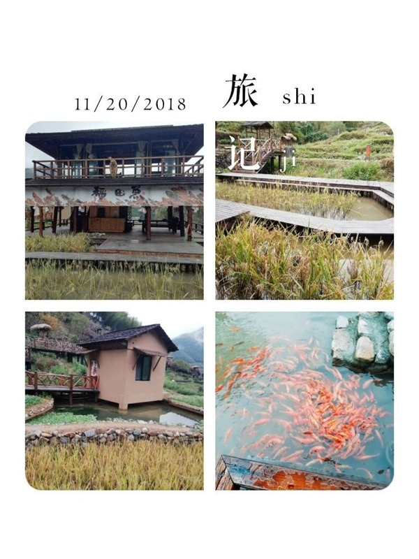 沿着小径上行,便到了稻鱼坊。小屋是两层围栏开放式中国古风建筑,视野特别敞亮。整个屋子立在水中央,一圈被水包围着,它的身后便是一片片金黄色的稻田,水里是不计其数的锦鲤。锦鲤非常的活泼,人走到哪里便跟到哪里。我不禁觉得有点可爱,买了鱼食投喂,他们争先恐后的争抢着,唯独怕抢不到食物的模样像极了年幼的孩童。