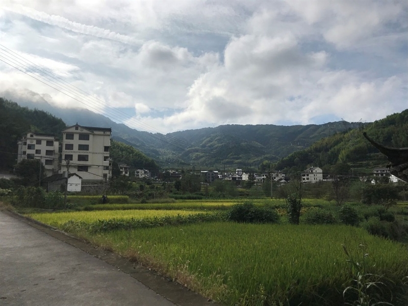 过了一座桥便是几处最为古老的民居。每一座民居的墙面上用黑色的水彩绘制出一幅幅水墨画,配以题词。家家户户门前种上绿植,修筑廊架,青藤爬上廊架。仿佛那一片民居也要被淹没在这些草木之中,偶见几分侧颜。此时的天翻滚着,天空中集聚出一朵硕大的乌云。这是否是要下雨的前奏。周围集聚的乌云越来越多。