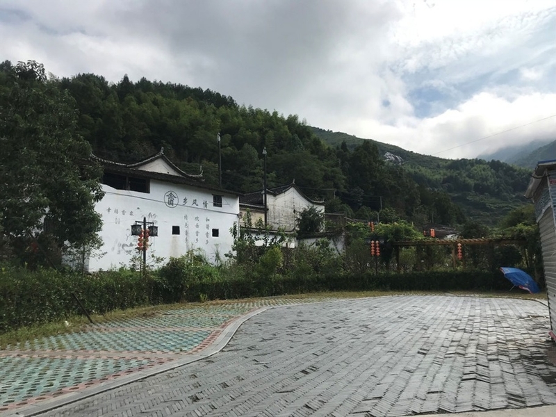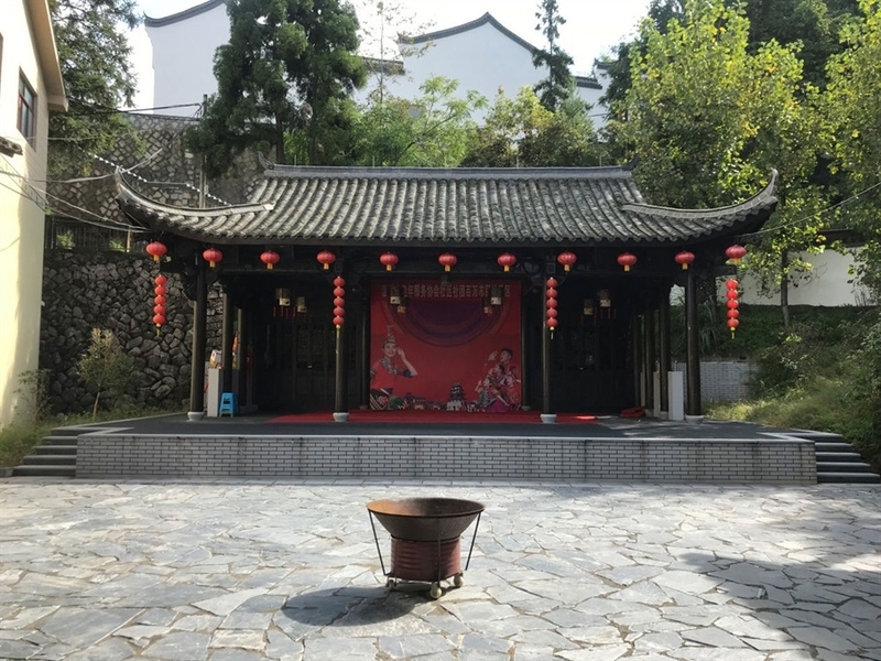 村子的尽头沿着指示牌而上,穿过封金山的门楼便是金丘文化礼堂。往常这里是篝火晚会和畲族婚嫁演示的场地。因这个季节是淡季,自然这些演出也暂时取消。白色的墙上,褐底斜放的字显得特别显眼,字大如斗,但是也别具一格。而另外一边是一个用青色文化砖搭建的戏台。小小的戏台两边各是四根木柱,中间立有四根木柱作为支撑。背景的海报上是畲族姑娘跟畲族小伙对歌的场景。这轻启的屋檐底下红色的灯笼显得特别惹眼,很是喜庆。