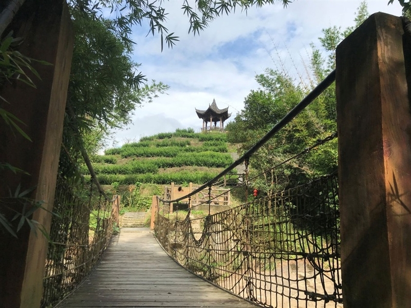 我走过那座斜祭上的铁索桥,踩过古旧腐朽的木板,抓过扶手上的绳网,一步步伴随着轻微的摇晃慢慢的走到对面。桥的对面是一座茶园,入了秋,茶园依旧一片辛绿,随坡而上包裹着整片山头。茶园顶端是一座六角亭,遗世而独立,它的身后是蓝天白云。