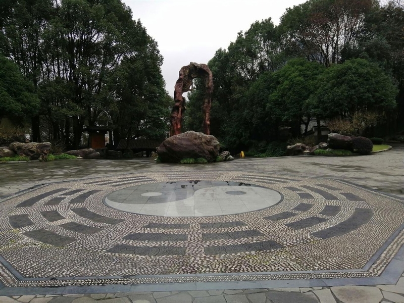 检票入门,一扇门雕塑就映入眼前,其以徐谷青大师《世纪门》为原型,既寓意求知悟道之法门,又寓意吉祥幸福,再加之两旁的奇石,茶文化雕塑以及地上的八卦图,共同组成了第一个景点——福门祥光。静静站立在一旁,也能感受到淡淡的禅意。