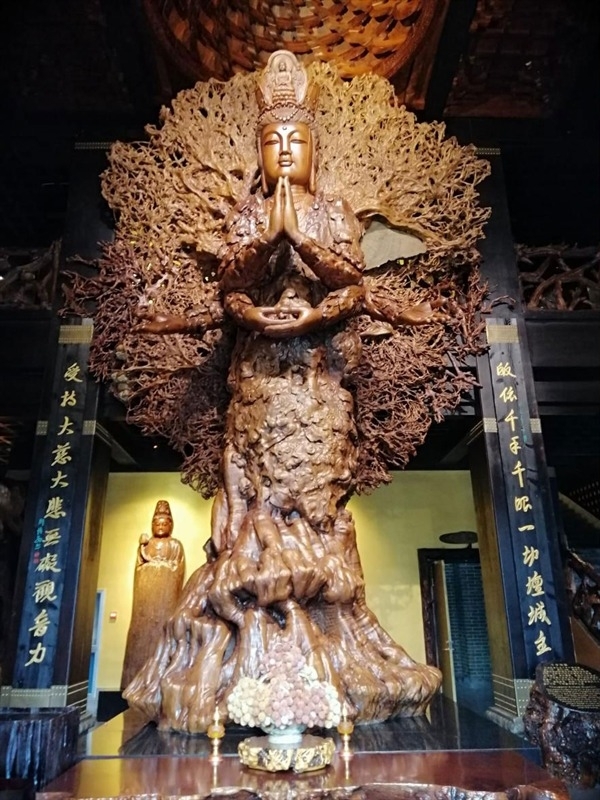 往里走,纵深有三座大殿,从前到后分别是未来佛殿、大雄宝殿、五百罗汉堂。分别陈列有弥勒佛、释迦牟尼佛、四大菩萨、四大金刚、十八罗汉、五百罗汉等在内的1000余件作品,其中大雄宝殿的释迦牟尼佛根雕,重达40余吨,是目前世界上最大的根雕佛像。佛像们形态各异、栩栩如生。站在这些大佛面前,就有一种“渺小”之感,不禁让我起敬畏之心,遂上前膜拜祈愿求佛。