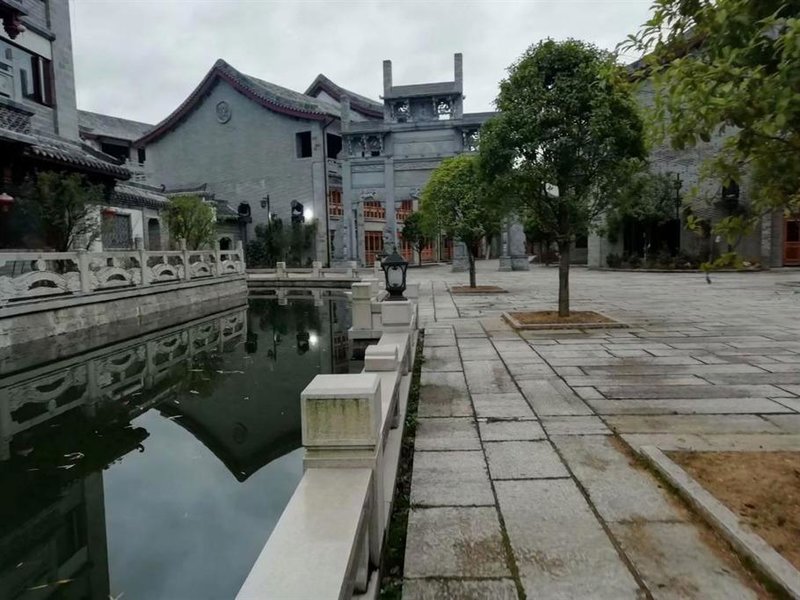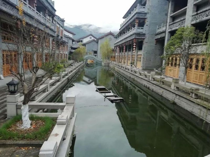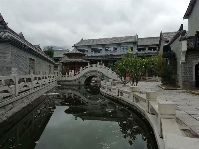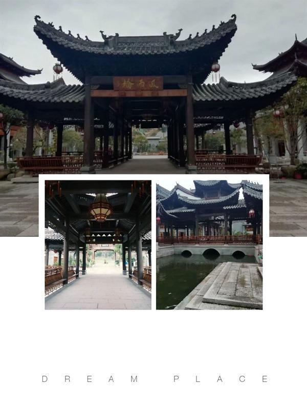 古镇右边有条小桥曲曲折折的铺设在河道之上。河道中心有个戏台。仿照宋朝时期的船只模样,戏台前方的石柱上是个龙头,后方是龙尾。刻画的微妙微俏。我循着曲曲折折的小道前行,仿佛这一刻自己站在湖心,戏台总有一种魅力让我循着它想去一探究竟。刚进去的时候,眼前空无一物。除了一个木质楼梯通往着阁楼。门口的牌匾上写着读古斋。想必以后这里肯定是个藏书的地方。我爬上二楼,依旧是空空如也。透过雕花的木质隔窗,往下望,底下的亭台轩榭一览无余,视线很好,我很喜欢站在高的地方望远处的风景。因为这样你不会错过任何一处美景。