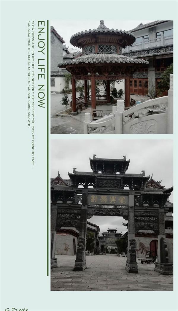 整个凤凰古镇的建筑群仿宋时期的建筑风格,在这个基础上,在与畲族文化元素相结合,在风格建筑上很有特点。青石板的地面铺设风格,青瓦铺成的檐顶。外立面采用大量的青色文化砖铺设,门窗皆用木结构,每个门窗上都雕刻着一个成语故事,每一笔每一画都把中国的传统美德融入到其中。你不得不赞叹,凤凰古镇的一砖一瓦,一亭一榭都刻画的很细致。沿着古镇中的主路往前走,道路两旁皆是民居,有些已经入住,还有些依旧是空楼。早上的阴天,来来往往的行人很少,屈指可数。