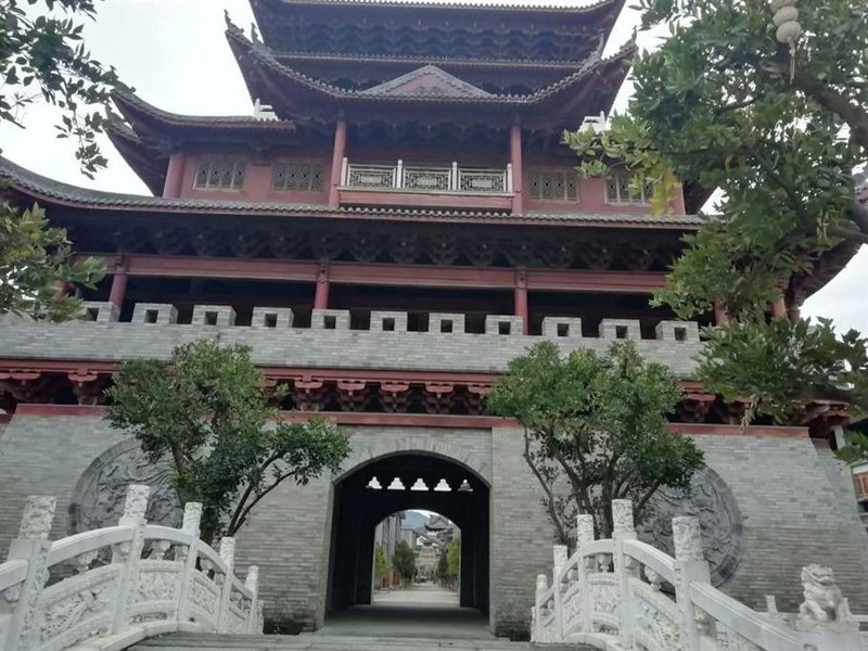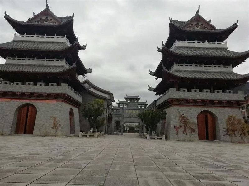 整个古镇的建筑面积很庞大,总共有261亩,在外观上是仿古宋代的一个建筑群。整个古镇由内而外依次是入口广场、入口牌坊、望海楼、古戏台、凤凰广场、风雨桥等等。